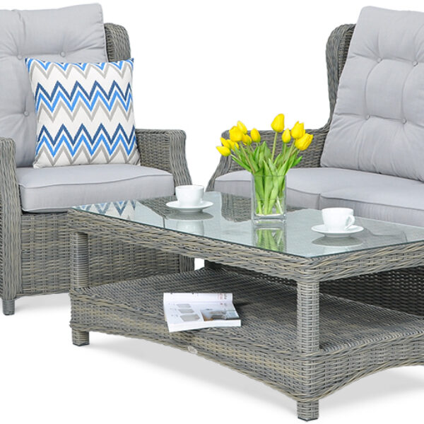 Komplet mebli ogrodowych z technorattanu, charakteryzujących się fantastyczną jakością. Zestaw wypoczynkowy Trivento 3 Grey zawiera 2 niezwykle komfortowe fotele, równie wygodną i szeroką, 3-osobową sofę oraz praktyczny stół - wyposażony w blat z hartowanego szkła oraz dodatkową półkę na rozmaite drobiazgi. Całość dopełniają stylowe, elastyczne poduchy na oparcia i siedziska, zgrabnie dopasowane kolorystycznie do szarych elementów. Już na pierwszy rzut oka meble ogrodowe z zestawu technorattanowego Trivento 3 przykuwają uwagę niebanalnym designem, a to tylko jeden spośród ich licznych atutów, wykonanie z najlepszych dostępnych materiałów, co w efekcie czyni z nich dobry zakup na dłuższe lata. Za żywotność oraz wytrzymałość mebli Trivento 3 Grey odpowiadają aluminiowe stelaże i technorattanowa plecionka: wyglądająca bardzo naturalnie, a przy tym posiadająca właściwości zaawansowanych tworzyw sztucznych. Oryginalne, kolory utrzymują pierwotną intensywność pomimo wystawienia mebli ogrodowych na działanie promieni słonecznych lub opadów - i to bez chemicznej konserwacji. Zestaw Trivento 3 jest mało uciążliwy w pielęgnacji, utrzymanie foteli, sofy i stołu w perfekcyjnym stanie wymaga jedynie wycierania wilgotną ściereczką bądź usuwania zabrudzeń wodą pod ciśnieniem. Połączenie wszystkich powyższych cech sprawia, że technorattanowe meble ogrodowe nadają się zarówno do użytku zewnętrznego, jak i też do wyposażenia reprezentacyjnych pomieszczeń. Jeśli poszukujesz uniwersalnego kompletu, który posłuży Ci przez wiele kolejnych sezonów, to zestaw wypoczynkowy Trivento 3 Grey sprawdzi się rewelacyjnie.