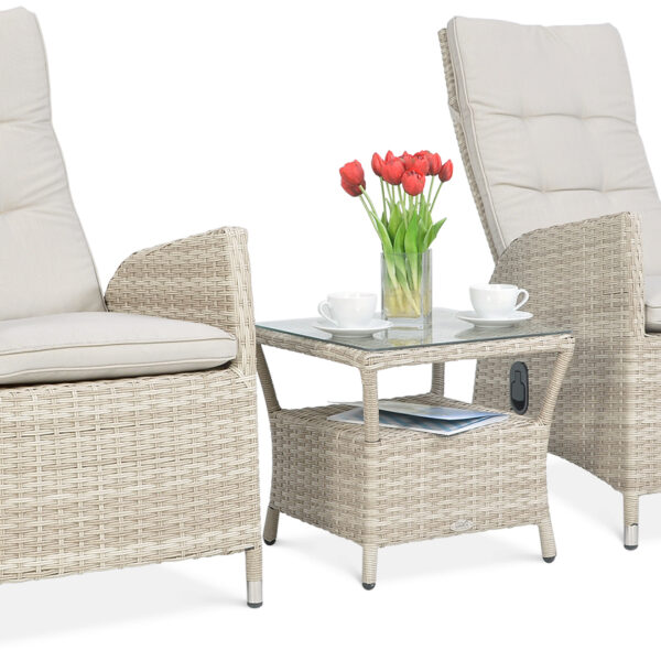 - w skład zestawu wchodzą 2 wygodne fotele z regulacją oparcia i funkcjonalny stolik kawowy