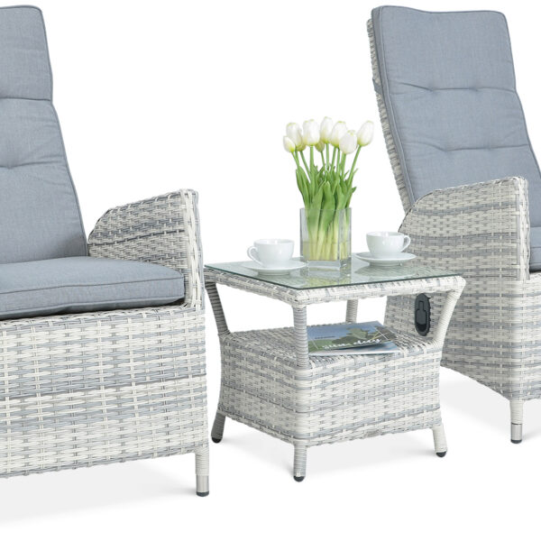 - w skład zestawu wchodzą 2 wygodne fotele z regulacją oparcia i funkcjonalny stolik kawowy