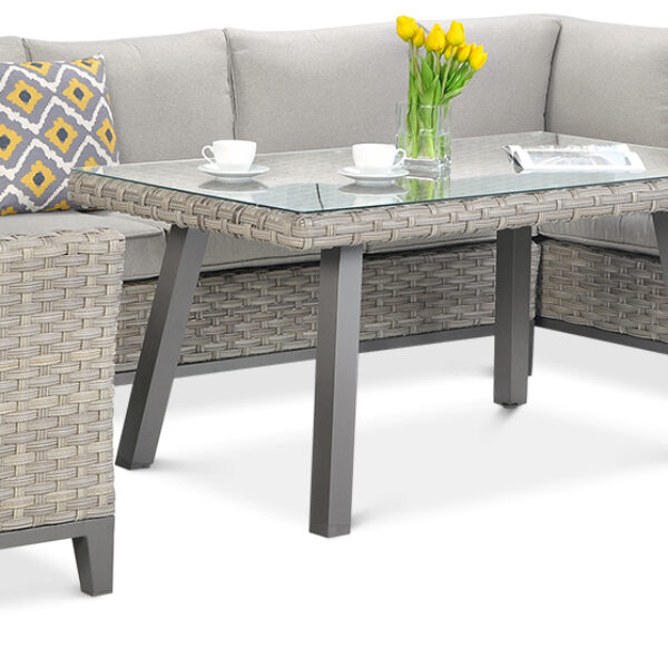 Stylowy i funkcjonalny zestaw mebli ogrodowych z technorattanu Malaga Dining + Fotel Beige. W jego skład wchodzą dwumodułowy narożnik Malaga, utrzymany w identycznej stylistyce fotel ogrodowy oraz duży, wysoki stół jadalniany na 4 efektownych nogach. Meble odznaczają się doskonałą jakością wykonania i modnym, niezwykle nowoczesnym designem. Moduły narożnika Malaga można bez problemu zamienić w 2 odrębne, trzyosobowe sofy. Do zestawu dołączone są wygodne poduszki na siedziska i oparcia, aby zwiększyć i tak wysoki poziom komfortu. Ich poszewki z zamkiem błyskawicznym ładnie komponują się z beżową plecionką pokrywającą stół, fotel oraz narożnik technorattanowy Malaga Beige. Cały zestaw powstał z materiałów najwyższej jakości, co zapewnia meblom ogrodowym dużą wytrzymałość i odporność. Aluminiowy stelaż, technorattan czy stołowy blat z hartowanego szkła posłużą Ci przez wiele sezonów. W narożniku Malaga nie ma elementów, które wymagałyby regularnej konserwacji. Obojętnie, czy korzystasz z mebli ogrodowych wyłącznie na zewnątrz, czy używasz ich też jako wyposażenia jadalni czy salonu. Narożnik Malaga Beige z fotelem i stołem ogrodowym są przystosowane do każdych warunków.