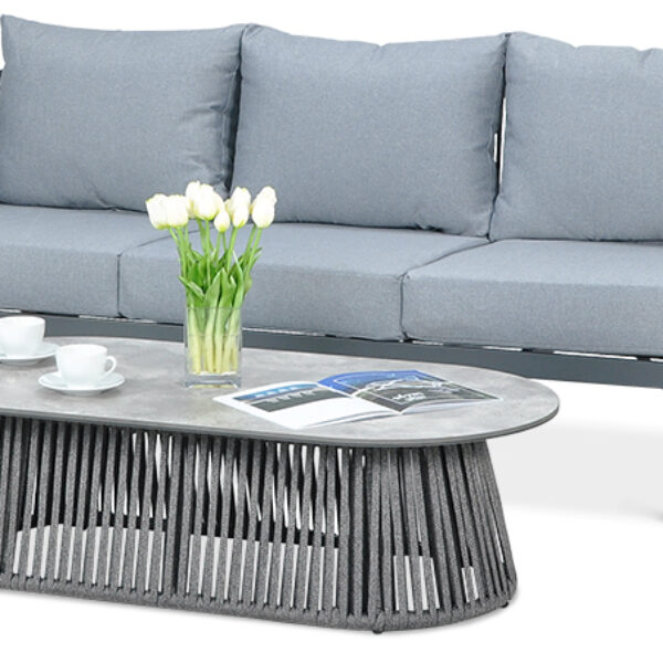 Ultranowoczesny komplet mebli ogrodowych najwyższej jakości. Efektowny zestaw wypoczynkowy Altea Caffe Grey składa się z dużej, 3-osobowej sofy, 2 foteli oraz jedynego w swoim rodzaju stolika kawowego z zaokrąglonym blatem. Wszystkie meble ogrodowe z powyższego kompletu charakteryzują się doskonałym komfortem oraz odważną stylistyką. Aluminiowe konstrukcje w połączeniu z nylonowymi sznurami sprawdzają się znakomicie w wielu różnych zastosowaniach. Z wypoczynkowym zestawem mebli ogrodowych Altea Caffe Grey urządzisz świetne garden party, a równie dobrze z jego pomocą umeblujesz salon. Sofa, fotele i stolik kawowy są wytrzymałe, odporne na niepogodę, a zarazem mało wymagające w utrzymaniu. Swój atrakcyjny wygląd zawdzięcza również efektownym wysokim nogom, które wyglądają na drewniane, ale w rzeczywistości to aluminium malowane specjalną techniką. Złóż zamówienie na wyjątkowe meble ogrodowe ze sklepu Focus Garden! Decydując się na kupno zestawu wypoczynkowego Altea Caffe Grey dokonasz znakomitego wyboru.