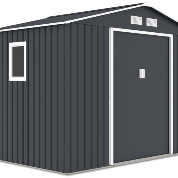 Domek HUDSON 9x6 cold grey to uniwersalna szopa narzędziowa z przesuwanymi drzwiami. Jest idealnym miejscem do przechowywania narzędzi, rowerów, kosiarek oraz sprzętu ogrodniczego. Całość została wykonana z wysokiej jakości materiałów - rama ze stali ocynkowanej oraz ocynkowane ogniowo panele stalowe o grubości 0,25 mm. Dzięki temu zapewniona jest najlepsza wytrzymałość, stabilność, trwałość oraz odporność na warunki atmosferyczne i korozję. Dwuspadowy dach zapobiega gromadzeniu się wody i śniegu, dzięki czemu gwarantuje bezpieczeństwo użytkowania. Cztery otwory wentylacyjne oraz dodatkowe okno zapewniają odpowiednią cyrkulację powietrza. Domek jest przeznaczony do montażu.