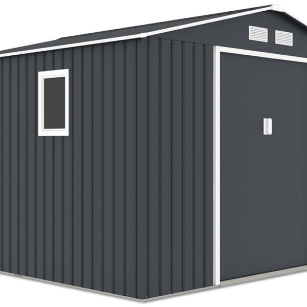 Domek HUDSON 9x8 cold grey to uniwersalna szopa narzędziowa z przesuwanymi drzwiami. Jest idealnym miejscem do przechowywania narzędzi, rowerów, kosiarek oraz sprzętu ogrodniczego. Całość została wykonana z wysokiej jakości materiałów - rama ze stali ocynkowanej oraz ocynkowane ogniowo panele stalowe o grubości 0,25 mm. Dzięki temu zapewniona jest najlepsza wytrzymałość, stabilność, trwałość oraz odporność na warunki atmosferyczne i korozję. Dwuspadowy dach zapobiega gromadzeniu się wody i śniegu, dzięki czemu gwarantuje bezpieczeństwo użytkowania. Cztery otwory wentylacyjne oraz dodatkowe okno zapewniają odpowiednią cyrkulację powietrza. Domek jest przeznaczony do montażu.