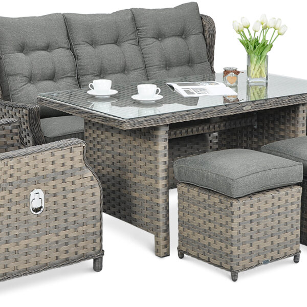 - w skład kompletu wchodzi funkcjonalna 3-osobowa sofa, 2 regulowane fotele, 2 pufy oraz duży stół