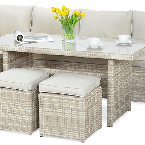 - w skład kompletu wchodzą 2 trzyosobowe sofy (które da się szybko połączyć w jedną, stabilną całość), fotel, 2 pufy oraz duży, prostokątny stół