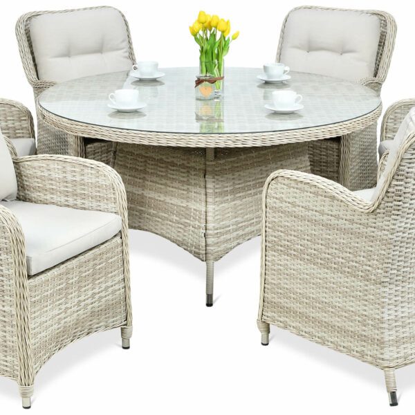 Marzysz o przytulnym kąciku do relaksu i ponad wszystko cenisz sobie elegancję i jakość? Zestaw mebli ogrodowych BARCELONA Beige pomoże Ci stworzyć idealną przestrzeń wypoczynkową! Do produkcji mebli wykorzystano lekką i niepodatną na korozję konstrukcję aluminiową (malowaną proszkowo), a także niezwykle odporny na niekorzystne działania atmosferyczne technorattan. Zestaw składa się z 6 wygodnych foteli oraz dużego, okrągłego stołu o średnicy 140 cm pokrytego blatem ze szkła hartowanego o grubości 5 mm. Meble posiadają wygodne poduszki oparciowe i siedziskowe zwiększające komfort użytkowania. Wykorzystane materiały sprawiają, że komplet jest lekki, stabilny i łatwy w utrzymaniu czystości – wystarczy przetrzeć go wilgotną ściereczką, a pokrowce poduszek uprać w pralce. Mieszane faktury technorattanu przypominają naturalny materiał i idealnie komponują się z ogrodową zielenią, natomiast uniwersale połączenie kolorystyczne pozwoli na dopasowanie zestawu do niemal każdej aranżacji. Dzięki zastosowaniu technorattanu i malowanego proszkowo aluminium meble charakteryzują się najwyższą odpornością na działanie niekorzystnych warunków: wiatru, wody, wilgoci, promieniowania UV, zmiennych temperatur. Zestaw nie blaknie, jego powierzchnie nie odkształcają się, co pozwoli na wielosezonowe użytkowanie.