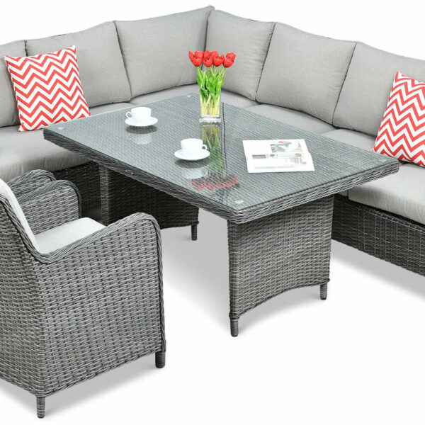 Stylowy i wielofunkcyjny komplet mebli ogrodowych z technorattanu. Zestaw wypoczynkowy z narożnikiem Maryland Dark Grey składa się z 2 modułów głównych, 2 foteli oraz dużego stołu. Liczba możliwych ustawień i konfiguracji pozwala błyskawicznie dostosować meble do potrzeby konkretnej chwili. Poziom wykonania wszystkich elementów, utrzymanych w ciemnoszarej kolorystyce, stoi na najwyższym poziomie. Narożnik technorattanowy Maryland może być zarówno jednym meblem, jak i też dwoma niezależnymi, 3-osobowymi sofami. W każdym wariancie, bez względu na okoliczności, użytkownik ma poczucie pełnego komfortu, do zestawu dołączone są poduchy na siedziska oraz oparcia, jeszcze bardziej poprawiające wygodę. Technorattanowa plecionka w odcieniach ciemnoszarych prezentuje się nadzwyczaj elegancko, identycznie jak naturalny materiał, jednak pod względem wytrzymałości meble z kompletu należą do zupełnie innej, wyższej ligi. Materiał wykazuje się odpornością na promieniowanie UV czy opady atmosferyczne. Meble ogrodowe z technorattanu są banalnie proste i mało wymagające w pielęgnacji. Cały zestaw wypoczynkowych mebli ogrodowych, w którym znajduje się narożnik Maryland Dark Grey z technorattanu, stanowi idealną propozycję dla osób oczekujących estetyki, wygody trwałości oraz szerokiej gamy możliwych zastosowań.