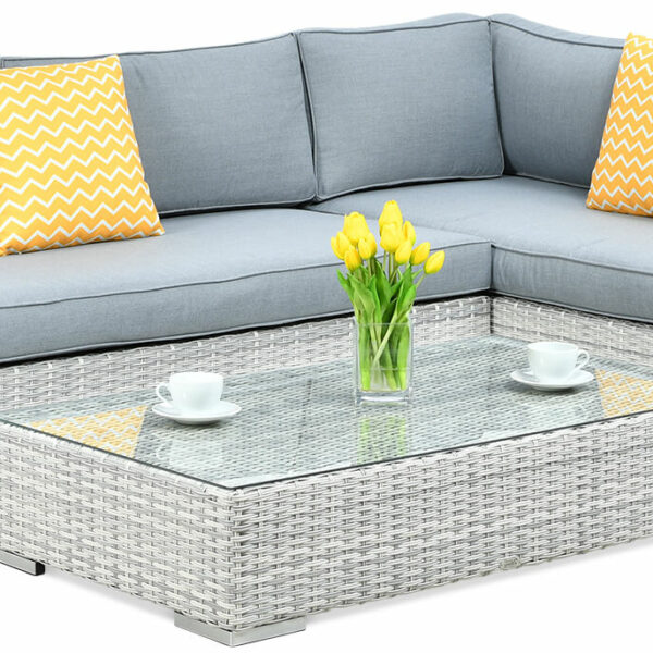 Narożnik z technorattanu VERONA White Grey rekomendujemy dla osób ceniących komfort oraz wyszukany i niepowtarzalny wygląd. Komplet składa się z dwóch modułów oraz stolika, które w wygodnych warunkach pozwolą wypić popołudniową kawę z przyjaciółmi lub rodziną. Zastosowane materiały zapewniają trwałość i odporność na warunki atmosferyczne, a eleganckie i gustowne wykończenia detali podkreślają jego wysoką jakość. Charakterystyczne przedłużenia modułów, powiększają optycznie zestaw nadając mu wyjątkowego uroku. Opcjonalnie mogą posłużyć jako półki na lekkie, drobne podręczne przedmioty Dla miłośników designu, gorąco polecamy.