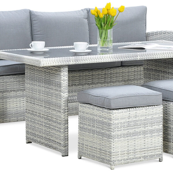 - w skład kompletu wchodzi funkcjonalna 3-osobowa sofa, 2 pufy, 2 fotele z poduchami oraz duży, prostokątny stół