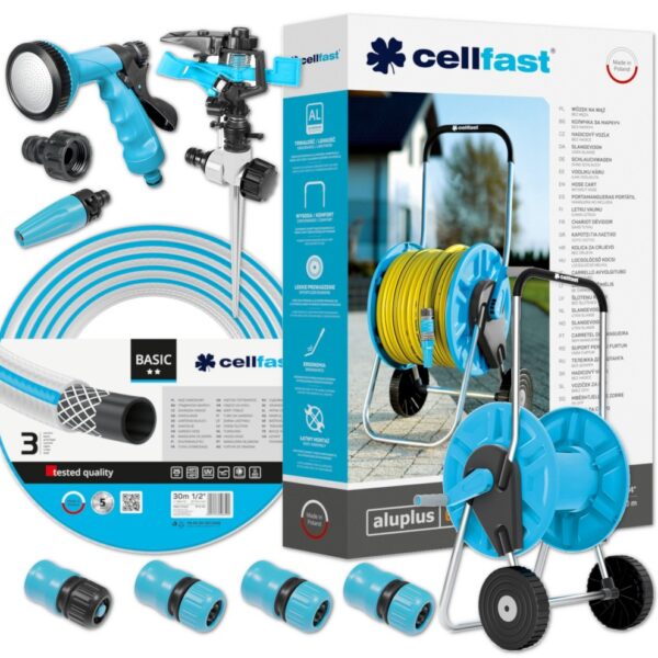 Zestaw Basic do nawadniania to idealny wybór do każdego ogrodu. Składa się z wytrzymałego węża, wózka do jego transportu i przechowywania, zraszaczy: pistoletowego, prostego i pulsacyjnego, szybkozłącza i przyłącza gwintowego. Jest kompatybilny z innymi produktami marki Cellfast. Wszystkie elementy charakteryzują się bardzo solidnym wykonaniem i odpornością na korozję. Wózek ma ergonomiczną konstrukcję, duże, wzmocnione koła radzące sobie na każdym terenie oraz stopki pozwalające zachować stabilność podczas odwijania węża. Całość jest kompaktowa i bardzo funkcjonalna.