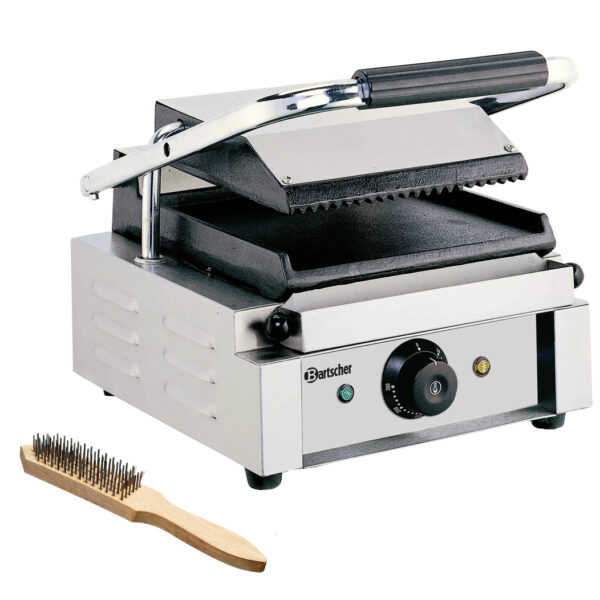 Grill kontaktowy elektryczny z górną płytą ryflowaną, a dolną gładką. Trwałe urządzenie ze stali chromowo-niklowej. W jego skład wchodzą płyty grillowe z żeliwa dla optymalnej wymiany ciepła, termostat regulowany w zakresie od 50°C do 300°C, lampka kontrolna nagrzania, lampka kontrolna włączenia/wyłączenia, miska do zbierania tłuszczu.Idealny do przygotowania przekąsek, podgrzewania pity, grillowania, ma wszechstronne zastosowanie.Górna płyta grillowa ryflowana: szer. 214 x gł. 214 mm.Dolna płyta grillowa gładka: szer. 220 x gł. 235 mm.