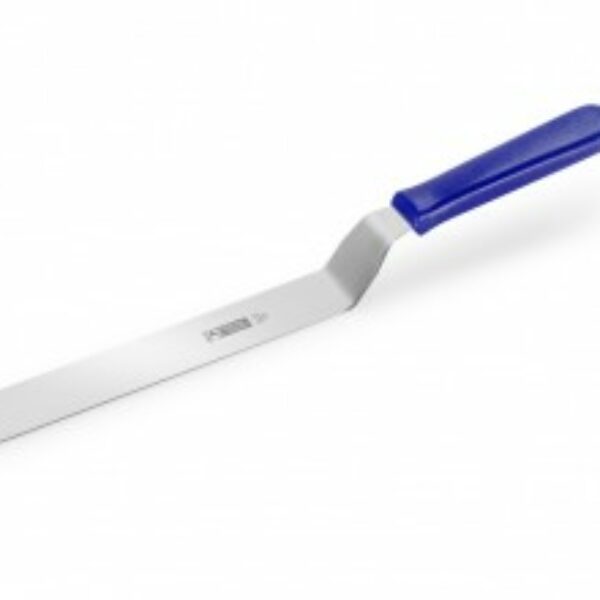 Łopatka kątowa z ostrzem ze stali nierdzewnej, nieostrymi brzegami do nakładania ciast i tortów. Rękojeść z tworzywa sztucznego w kolorze niebieskim. Na ostrzu umieszczone logo Polmarkus.