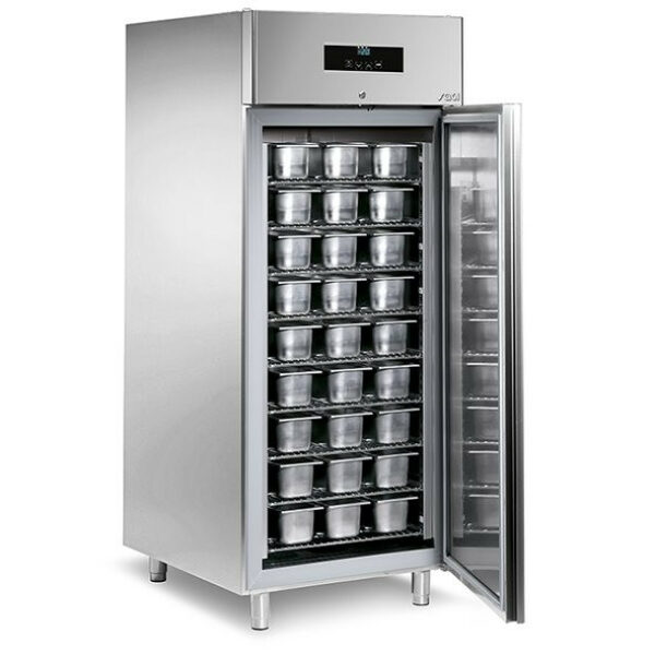 Szafa mroźnicza SAGI KAGL6B jednodrzwiowa z serii ICE CREAM wykonana ze stali nierdzewnej AISI 304. Wymiary komory chłodniczej według rozmiarów kuwet lodowy o rozmiarze 360x165x120 mm.Maksymalna pojemność szafy to:54 szt. kuwety o rozmiarze 360x165x120 mm44 szt. kuwety o rozmiarze 360x250x80 mm36 szt. kuwety o rozmiarze 360x250x120 mmZakres temperatur od -24 do -12 st.C.Szafa o wymiarach (szer. / gł. /wys.) 750 x 900 x 2040 mm. W standardowym wyposażeniu posiada 6 półek. Maksymalna ilość półek w jednej komorze szafy do 9, dodatkowe półki należy dokupić osobno. Szafa mroźnicza może pracować w temperaturze otoczenia do +43 st.C.SAGI KAGL6B dzięki zastosowaniu innowacyjnych rozwiązań posiada boczny obieg powietrza, dzięki czemu na lodach nie powstaje szron, nie ma potrzeby owijania lub zamykania kuwet z lodami przed włożeniem do szafy.Szafa KAGL6B posiada również funkcję automatycznego rozmrażania gorącym gazem, drzwi zabezpieczone zamkiem oraz elektroniczny panel sterujący.