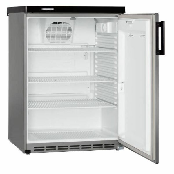 Profesjonalna szafa chłodnicza podblatowa Liebherr FKvesf 1805 w kolorze srebrnym. Wnętrze szafy w kolorze białym wykonane z tworzywa sztucznego, automatyczne odszranianie. Liebherr FKvesf 1805 posiada 3 półki, ruszty wykonane z tworzywa sztucznego pokrytego powłoką ochronną, maksymalne obciążenie jednej półki do 45 kg.Zakres temperatur od +1 do + 15 st.C, cyfrowy wskaźnik temperatury na zewnątrz.