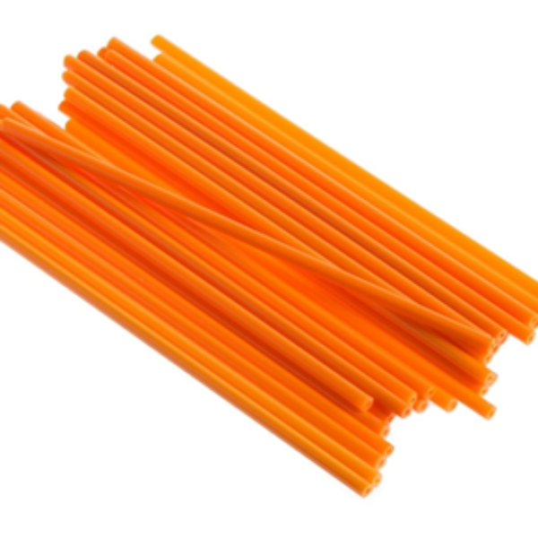 Plastikowe patyczki do lizaków w kolorze pomarańczowym. Długość 15 cm, średnica ok. 4 mm. Patyczki niezbędne do wyrobów lizaków lub cake pops'ów.