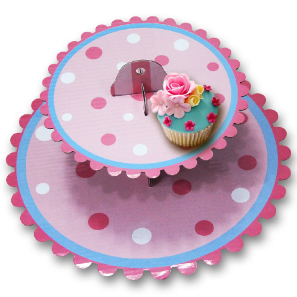 Ozdobny, okrągły stojak na muffinki, babeczki lub ciastka, wykonany z grubej tektury, urozmaici dziecięce spotkania w gronie znajomych.Kolor: różowyŚrednica: 33 cm dolny talerz, 22,5 cm górny talerzCena dotyczy jednego stojaka.