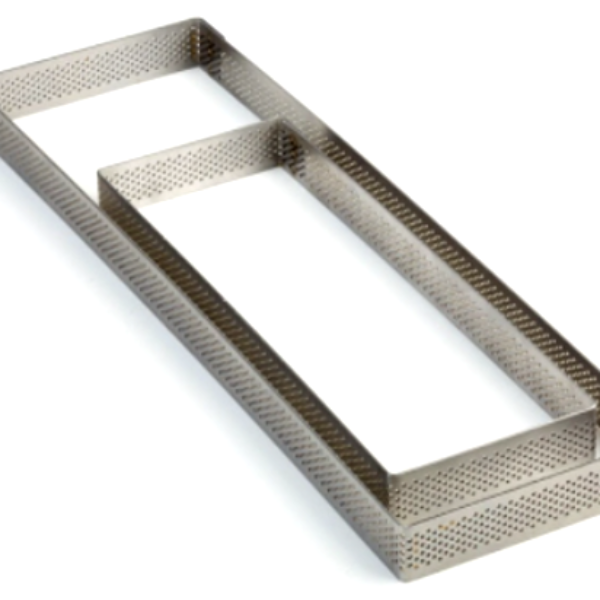 Perforowany rant nierdzewny, prostokątny o wymiarach 19x7 cm i wysokości 2 cm. Charakteryzuje się wysoką odpornością na zużycie oraz bardzo dobrą jakością wykonania. Dzięki perforacji woda odparowuje z ciasta przez otwory, zapobiegając tworzeniu się pęcherzy. Szczególnie polecany do produkcji tart.