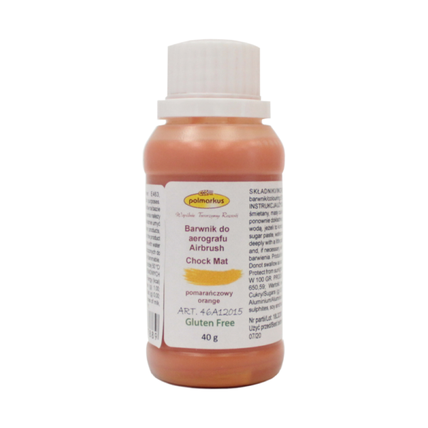 Wysokiej jakości syntetyczny barwnik spożywczy w postaci płynu na bazie alkoholu, w stężeniu gotowym bezpośrednio do napylenia.Bardzo ładny i intensywny pomarańczowy kolor oraz wygodne w użyciu opakowanie. Produkt bezglutenowy.Skład: etanol, barwnik E101, E120, zagęszczacz E463.Sposób użycia: do dekoracji wyrobów cukierniczych. W szczególności do produktów na bazie śmietany, masy cukrowej, wafli, tortów i ciast. Wstrząsnąć mocno przed użyciem. Po dłuższym okresie nieużywania należy ponownie dokładnie zamieszać. W celu naniesienia dekoracji należy użyć aerografu. Po zakończeniu pracy dokładnie umyć wodą, jeżeli to koniczne alkoholem.Uwagi: przeznaczone do użycia na produktach spożywczych dopuszczonych do barwienia. Spożywać tylko jako dekoracje.Przechowywanie: przechowywać w zacienionym miejscu w temperaturze poniżej 50 °C.