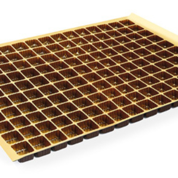 Praktyczne i eleganckie opakowanie wykonane z wysokiej jakości tworzywa sztucznego w kolorze złotym. Posiada 150 gniazd o wymiarach 2,8x3,3 cm każde, odpowiednie do przechowywania czekoladek i pralin.