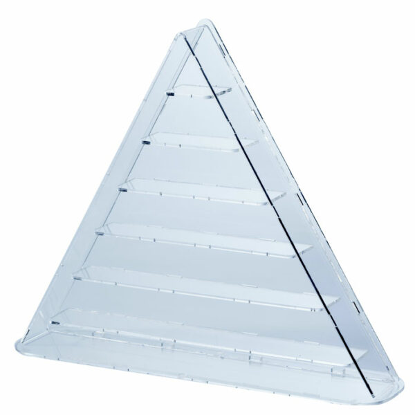 Ekspozytor na makaroniki w kształcie piramidy wykonany z plexi. Piramida umieszczona na podstawie o rozmiarze 50,5 x 12,5 cm. Szerokość piramidy u podstawy to 47,5 cm, wysokość 42 cm. Głębokość 6,5 cm. Stojak na makaroniki wyposażony jest w 6 półek o długości odpowiednio 41, 34, 27, 20, 13 i 6 cm.Głębokość półki ~ 5 cm.Odstęp pomiędzy półkami ~ 5,5 cm.