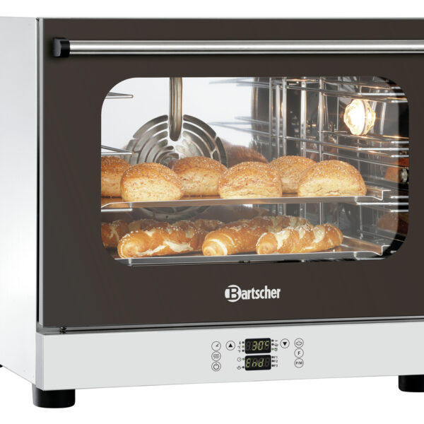 Profesjonalny piec konwekcyjny z obudową i komorą wykonanymi ze stali nierdzewnej. Do zalet tego urządzenia należy zaliczyć czytelny wyświetlacz LED, sterowanie elektroniczne z 3 fazami gotowania oraz silnik z rewersem zapewniający odpowiednie warunki obróbki termicznej.Odstęp pomiędzy prowadnicami 75 mm, drzwi z podwójną szybą. Oświetlenie wewnętrzne, stałe przyłącze wody 3/4". Regulacja temperatury od 0 °C do 260 °C