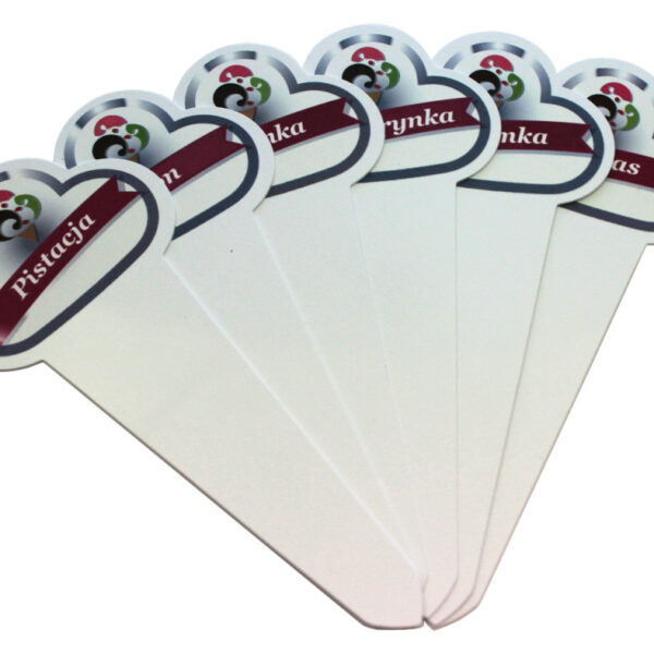 Wtykacze przeznaczone do umieszczania w kuwecie lodowej. W atrakcyjny sposób informują o smaku lodów. Posiadają atest do kontaktu z żywnością. Komplet zawiera 120 szt. w tym 98 szt. z popularnymi smakami.11 szt. nowość oraz 11 szt. nasza specjalność z możliwością wpisania własnego smaku.Smaki z niebieskim tłem:ali baba, amaretti, amaretto, beza, biała czekolada, biała kawa, cappucino, cassata siciliana, ciasteczka, cynamon, czekolada, czekolada z orzechami, czekolada-orzech, gianduja, czekolada i orzech laskowy, gorzka czekolada, guma do żucia, jogurt, jogurt z wiśnią, karmel, kasztan, kawa, kokos, krem z nutą wanilii i cytryny, krokant w rumie, latte macchiato, lukrecja, malaga, marcepan, mascarpone, migdał sycylijski, miodowe, mleczna czekolada, napoleonka, nutella, orzech arachidowy, orzech laskowy, orzech włoski, otella, panna cotta, piernikowe, pistacja oro verde, pop corn, rafaello, roche, rum, snicers, stracciatella, śmietanka, tiramisu, toffee mou, torrone, trufla, waniliawhisky, włoski pocałunek, zabajoneSmaki z granatowym tłem:ananas, arbuz, banan, brzoskwinia, cytryna, czarna porzeczka, czarny bez, czerwona porzeczka, figa, granat, gruszka, jabłko, jagoda, jaśmin, jeżyna, jogurt i wiśnia, kaktus, kiwi, lemon, liczi, limonka, malina, mandarynka, mango, marakuja, melon, mięta, mojito, owoce leśne, papaja, pinacolada, pistacja, pomarańcza, poziomka, róża, różowy grapefruit, szarlotka, truskawka, wiśnia, wiśnia amarena, zielone jabłko, żurawina