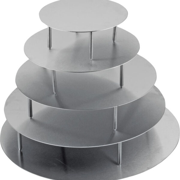 Elegancki stojak nierdzewny do tortów w stylu angielskim, posiadający 5 pięter z okrągłymi talerzami o średnicy 18/24/30/35/40 cm i szpilkami o średnicy 8 mm i wysokości 7 cm.