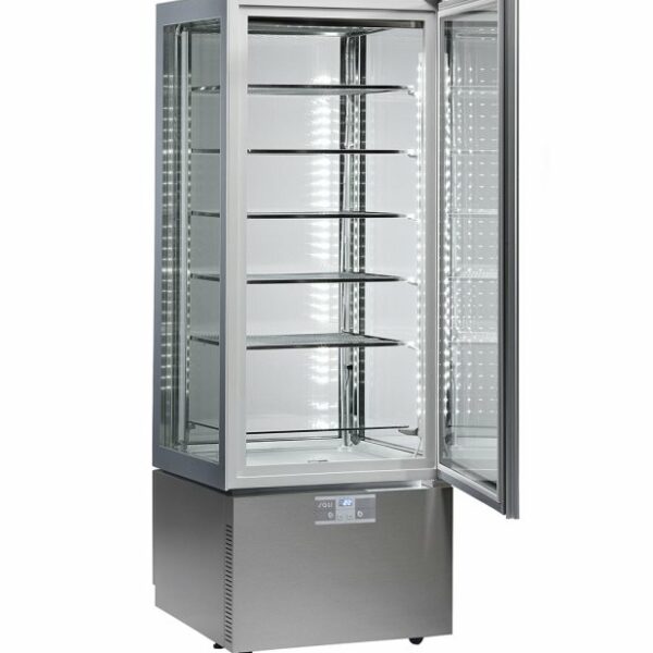 Witryna mroźnicza wykonana ze stali nierdzewnej z sito drukiem i hartowanym szkłem. Posiada specjalną powłokę zapobiegającą zostawianiu odcisków palców oraz oświetlenie ledowe. Posiada również statyczne chłodzenie i ręczny system odszraniania.