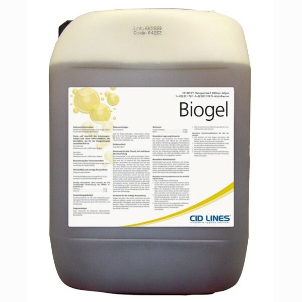 Bio Gel jest to alkaliczny środek myjący w postaci żelu, dzięki której dłużej utrzymuje się na mytych powierzchniach. Przeznaczony do stosowania w każdym sektorze przemysłu spożywczego oraz rolnictwie.Właściwości preparatu Bio Gel:zawiera wodorotlenek sodu, niejonowe tenzydy, związki komplaksujące oraz zwilżającezostał specjalnie opracowany do usuwania tłuszczu, osadów z dymu, smoły i cukrów z miejsc trudno dostępnych dla standardowych produktów myjącychmoże być stosowany w dowolnym urządzeniu myjącym - bez dodatkowych inwestycjiAplikacja produktu Bio Gel:stężenie od 3 do 5% postać gęstej pianystężenie od 5 do 10% postać żeluCzas kontaktu produktu Bio Gel z powierzchnią:od 10 do 60 minut. Spłukać wodą.Specyfikacja: Postać: bursztynowy płyn, pH: 12,5, Gęstość: 1.06 kg/L, Temperatura krzepnięcia: - 15°C, Temperatura wrzenia: 90°C, Lepkość dynamiczna: < 2000 cP (10%) Przechowywanie i usuwanie preparatu Bio GelPrzechowywać wyłącznie w oryginalnym opakowaniu w chłodnym i dobrze wentylowanym miejscu. Opakowanie z produktem powinno być zamknięte, gdy nie jest w użyciu. Postępowanie z odpadami produktu/odpadami opakowaniowymi po produkcie: odpady produktu oraz opakowania zanieczyszczone produktem oddawać wyłącznie do wyspecjalizowanych przedsiębiorstw zagospodarowania odpadów. Nie umieszczać w odpadach komunalnych. Unikać zrzutów do środowiska.Instrukcja bezpieczeństwa dla użytkownikaNależy myć ręce i pozostałe narażone na kontakt części ciała delikatnym mydłem i wodą przed jedzeniem, piciem, paleniem i przed wyjściem z pracy. Należy dołożyć wszelkich starań, aby ograniczyć możliwość kontaktu z oczami. W przypadku kontaktu z oczami: przepłukać obficie wodą i wezwać lekarza. W przypadku kontaktu ze skórą: zdjąć zanieczyszczoną odzież i obuwie, umyć dokładnie zanieczyszczone miejsca wodą z delikatnym mydłem, spłukać dużą ilością wody, zgłosić się do lekarza. W przypadku spożycia przepłukać usta wodą. Nie wywoływać wymiotów. Natychmiast udać się do szpitala. W przypadku zatrucia inhalacyjnego wyprowadzić poszkodowanego na świeże powietrze, pozwolić mu odpocząć. Niezwłocznie należy skontaktować się z lekarzem. Chronić przed dziećmi.Zawsze, przed pierwszym zastosowaniem produktu należy zapoznać się z treścią Karty Charakterystyki oraz ulotki technicznej produktu.Przed każdym użyciem należy przeczytać etykietę i informacje dotyczące produktu.Producent: CID LINES NV, Waterpoortstraat, 2, B-8900 Ieper Belgia, Tel + 32 57 21 78 77, Faks + 32 57 21 78 79, info@cidlines.com