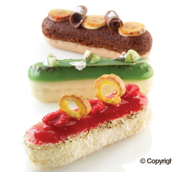 Forma silikonowa w kolorze białym, idealna do stworzenia różnego rodzaju musów, semiffreddo czy eklerków o wymiarach 129x40 mm i wysokości 35 mm. W zestawie z formą znajduje się również wykrawaczka przeznaczona do wykrawania wkładek lub podstaw doskonałych deserów.Forma zawiera 6 gniazd o pojemności 140 ml każde.Numer produktu Silikomart: 36.197.87.0065