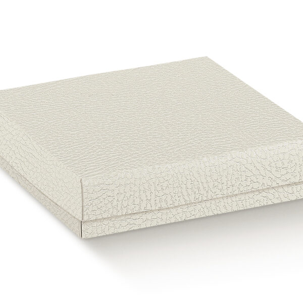 Eleganckie pudełko wykonane z wysokiej jakości tektury z oryginalnym tłoczeniem (imitacja skóry) w kolorze białym z przykrywką i złotą wkładką. Doskonale nadaje się do pakowania pralin, trufli i czekoladek.