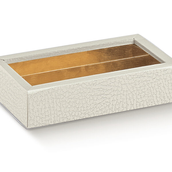 Eleganckie pudełko wykonane z wysokiej jakości tektury z oryginalnym tłoczeniem (imitacja skóry) w kolorze białym ze złotą wkładką i okienkiem doskonale eksponującym wyroby cukiernicze. Posiada również przezroczystą opaskę wykonaną z tworzywa sztucznego, która chroni zapakowane produkty przed zniszczeniem. Idealnie nadaje się do pakowania pralin, trufli i czekoladek.