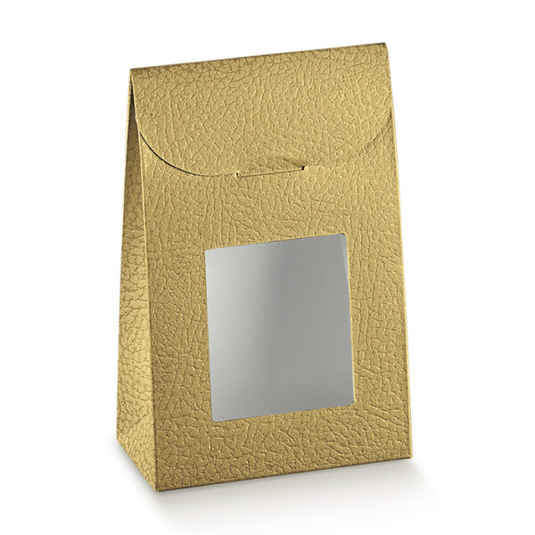 Eleganckie pudełko na praliny w formie torebki o wymiarach 9x4,5x13 cm wykonane z wysokiej jakości kartonu z oryginalnym tłoczeniem (imitacja skóry) w kolorze złotym z okienkiem, doskonale eksponującym wyroby cukiernicze. Idealnie nadaje się do pakowania pralin, trufli i czekoladek.