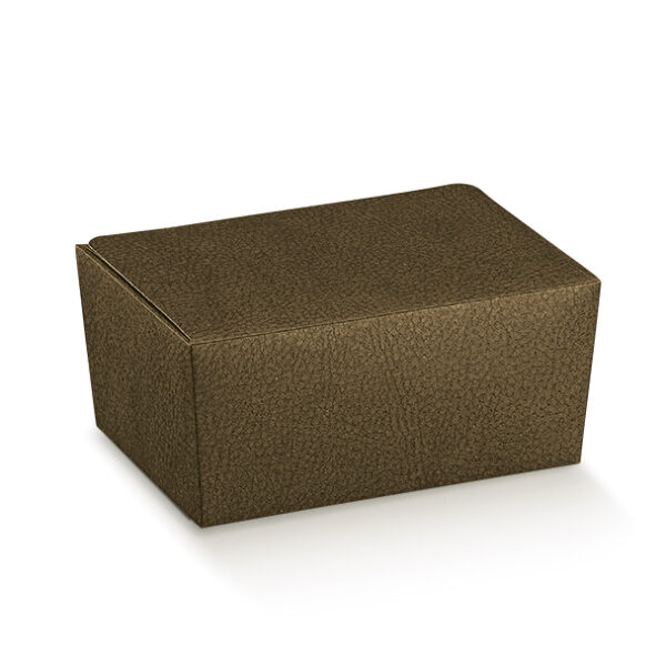 Eleganckie pudełko wykonane z wysokiej jakości tektury w kolorze brązowym z oryginalnym tłoczeniem (imitacja skóry). Doskonale sprawdzi się do pakowania pralin, trufli i czekoladek.