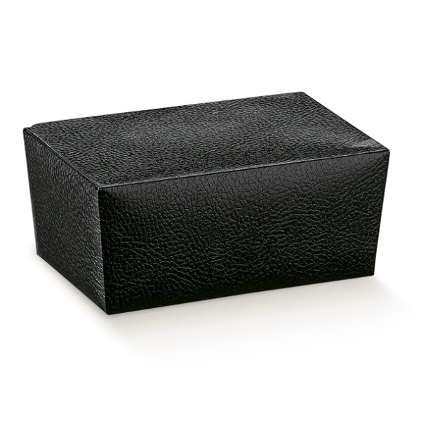 Eleganckie pudełko wykonane z wysokiej jakości tektury w kolorze czarnym z oryginalnym tłoczeniem (imitacja skóry). Doskonale sprawdzi się do pakowania pralin, trufli i czekoladek.
