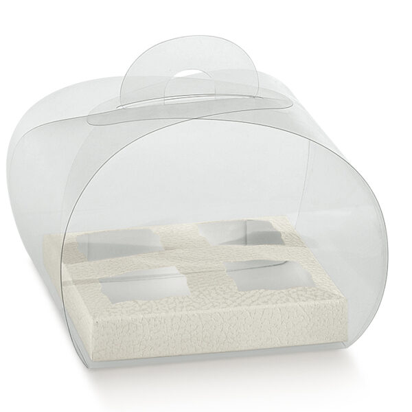 Eleganckie opakowanie wykonane z wysokiej jakości tworzywa sztucznego. Proste do złożenia, posiada rączkę ułatwiającą przenoszenie. Do kompletu dołączona została tacka z 4 gniazdami o średnicy 40 mm na pucharki zapełnione różnego rodzaju deserami. Opakowanie chroni produkty w pucharkach przed zniszczeniem w trakcie transportu.