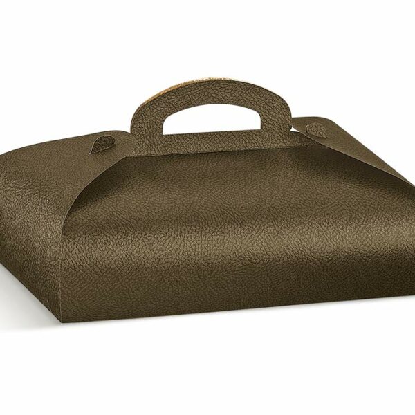 Elegancki karton wykonany z wysokiej jakości tektury z oryginalnym tłoczeniem (imitacja skóry) w kolorze brązowym. Posiada uchwyt, dzięki czemu doskonale nadaje się do przenoszenia tortów i ciast. Opakowanie nie tylko ułatwia transport, ale również chroni wypieki przed zniszczeniem.