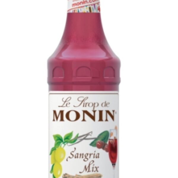 Sangria jest perfekcyjnie nadającym się na imprezy ponczem, który wszyscy lubią. Jest to wino owocowe, które kojarzy się ze smakiem Hiszpanii. Tradycyjnie Sangrię robi się z czerwonego wina, brandy, przypraw i owoców. Podczas produkcji zostawia się owoce w środku mikstury na parę godzin, aby aromaty mogły się dobrze wymieszać. Syrop Monin Sangria, to bezalkoholowy aromat tradycyjnej Sangrii zamknięty w butelce i gotowy do użycia. Wystarczy dodać go do wina i soku pomarańczowego z odrobiną lodu, aby poczuć hiszpański klimat. Dzięki jego cynamonowo-owocowemu smakowi Monin Sangria idealnie się nadaje także jako składnik napojów bezalkoholowych.Syrop posiada czerwony winny kolor o owocowym aromacie z nutą przypraw, głównie wiśni, pomarańczy i cynamonu.Szczególnie polecany do drinków alkoholowych i bezalkoholowych.Skład: cukier, woda, kwas cytrynowy, aromat naturalny, zagęszczony sok z cytryny, zagęszczony sok wiśniowy, naturalny aromat pomarańczowy i cytrusowy, naturalny aromat waniliowy z innymi naturalnymi aromatami, barwnik: E163, naturalny aromat cynamonowy z innymi naturalnymi aromatami. Sok owocowy ogółem: 10%.