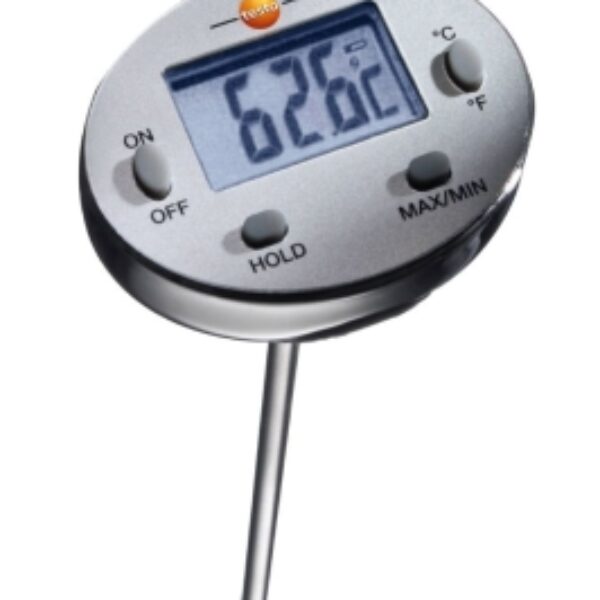 Praktyczny, a zarazem solidny, wodoodporny minitermometr, który po użyciu np. do punktowego pomiaru temperatury w produkcji żywności można po prostu umyć pod bieżącą wodą, a nawet w zmywarce do naczyń. Wyposażony jest w czytelny wyświetlacz LCD, sondę o długości 120 mm i funkcję HOLD, dzięki której wynik pomiaru jest zapamiętywany na wyświetlaczu, oraz przycisk MAX/MIN wskazujący progi pomiarowe. Idealny do wielu zastosowań - w powietrzu oraz w miękkich lub proszkowanych substancjach i w płynach.Typ baterii: guzikowa LR44. Zakres pomiarowy: -20 do +230 °C.