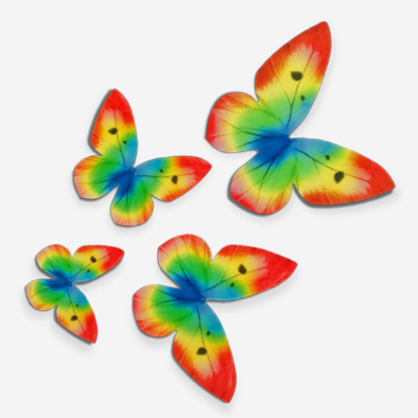 Motylki opłatkowe w tęczowych kolorach opak.87 sztuk firmy DAISY DECOR 403887.Motyle zostały wykonane z wielobarwnego opłatka, dzięki takiemu zabiegowi wyglądają bardzo ładnie. Będą świetnie pasowały do tortów urodzinowych, ale i do mniejszych wyrobów ciastkarskich.