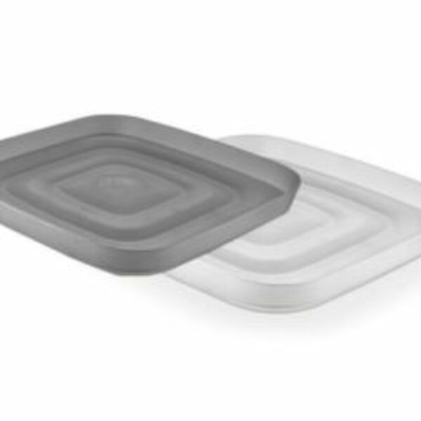 Prostokątna taca wykonana z wysokiej jakości przeźroczystego tworzywa sztucznego w kolorze białym.
