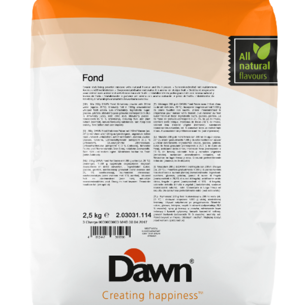 Fondy Sucrea to najwyższej jakości komponenty proszkowe (rozpuszczalne w zimnej wodzie, z cząstkami owoców) przeznaczone do produkcji tortów śmietanowych, deserów i musów.Produkty na bazie tych komponentów nadają się do zamrażania i są odporne na rozmrażanie. Stosowanie ich zapewnia stałą i wysoką jakość wyrobów cukierniczych oraz pozwala skrócić czas produkcji, a co za tym idzie ograniczyć koszty.Stabilizatory z oferty Dawn Foods odznaczają się dużą wydajnością i bardzo prostym sposobem przygotowania. Receptura podstawowa:Sucrea Fond 250 Woda 400 mlUbita, niesłodzona śmietana 1000 g250 g proszku DAWN Fond Jogurtowy wymieszać z 400 ml wody (ok. 20°C). Stopniowo dodawać do 1000 g niesłodzonej ubitej śmietany. Do natychmiastowego wykorzystania.