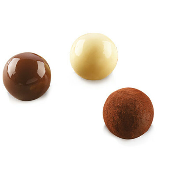 Forma silikonowa z gniazdami idealnymi do stworzenia czekoladek w kształcie kulek 3D. Posiada specjalną powłokę zapobiegającą przywieraniu, przez co gotowe wyroby można w bardzo prosty sposób wyjąć z formy, bez obawy o jakiekolwiek uszkodzenia. Dodatkowo każde gniazdo formy wyposażone jest w specjalną, wewnętrzną ramkę nadającą lekko zaokrąglony kształt podstawie przygotowanych trufli.Numer produktu Silikomart: 22.150.77.0065