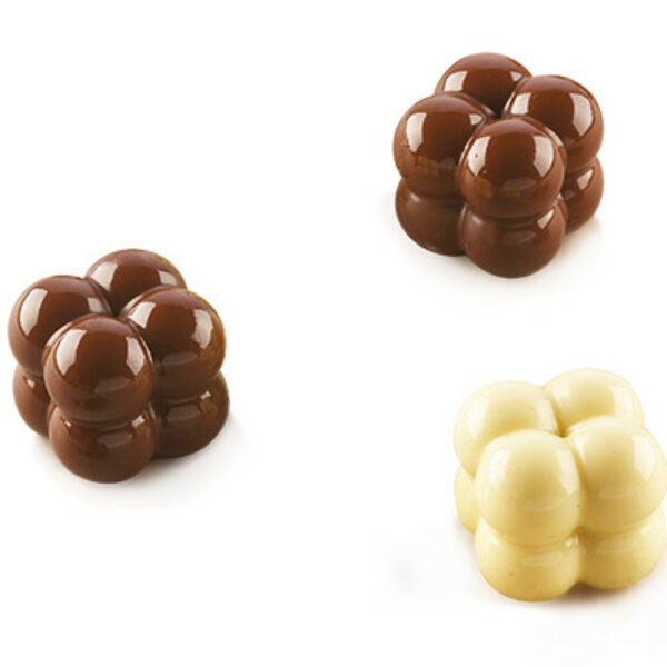 Forma silikonowa z gniazdami idealnymi do stworzenia czekoladek w kształcie połączonych kulek tworzących kostki 3D. Posiada specjalną powłokę zapobiegającą przywieraniu, przez co gotowe wyroby można w bardzo prosty sposób wyjąć z formy, bez obawy o jakiekolwiek uszkodzenia. Dodatkowo każde gniazdo formy wyposażone jest w specjalną, wewnętrzną ramkę nadającą lekko zaokrąglony kształt podstawie przygotowanych czekoladek.Numer produktu Silikomart: 22.151.77.0165