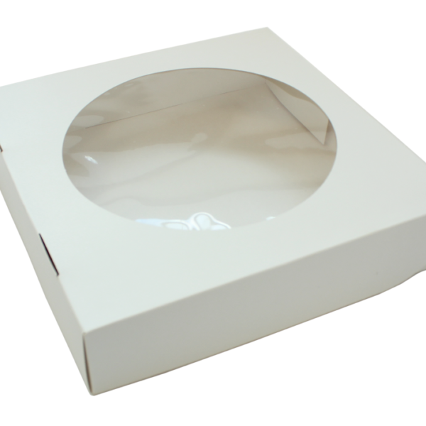 Białe, eleganckie pudełko na tartę o wysokości 6 cm, z okrągłym przeźroczystym okienkiem o średnicy 20 cm. Opakowanie zbiorcze 10 sztuk. Tartę w pudełku najlepiej umieścić na podkładzie do tortów.