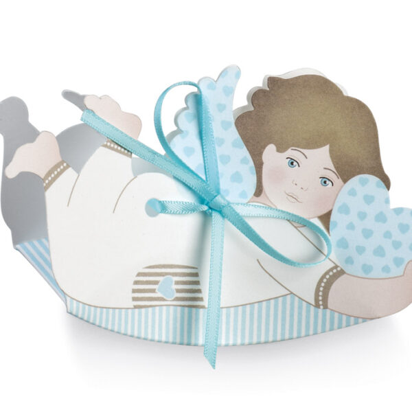 Eleganckie pudełko w formie niebieskiego aniołka wykonane z wysokiej jakości tektury z ozdobną wstążką. Idealnie nadaje się do pakowania drobnych cukierków, pralin, trufli i czekoladek.