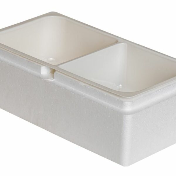 Wkład w kolorze białym do pojemnika termoizolacyjnego do lodów na wynos Impilo. W zestawie razem z wkładką z tworzywa sztucznego, która dzieli pojemnik na dwie równe części po 250 g. Doskonałe rozwiązanie do wydawania lodów o różnych smakach - dużo wygodniej oddzielisz smaki lodów tradycyjnych od sorbetów.Uwaga! Wkład nie posiada dna ani pokrywki - jest to opcjonalna część pojemnika do lodów Impilo.Wymiary wewnętrzne 170,5 x 87,5 mm H 47 mm