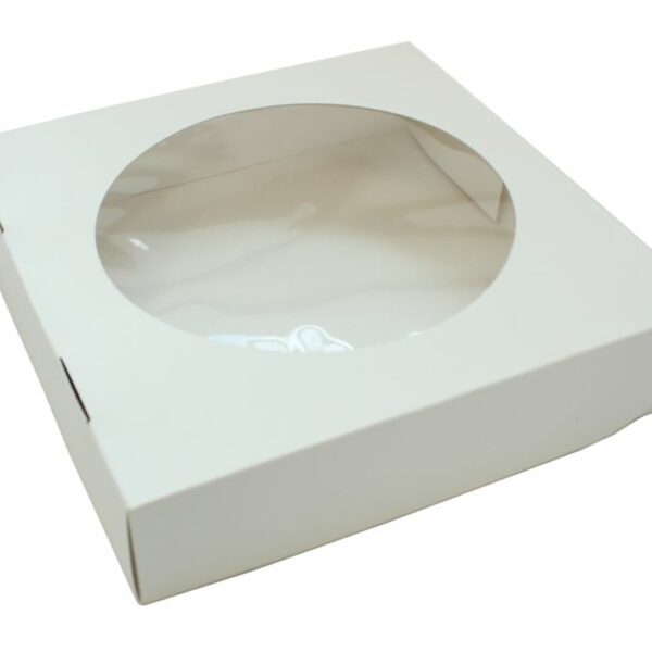 Białe, eleganckie pudełko na tartę o wysokości 8 cm, z okrągłym przeźroczystym okienkiem o średnicy 20 cm. Opakowanie zbiorcze 10 sztuk. Tartę w pudełku najlepiej umieścić na podkładzie do tortów.