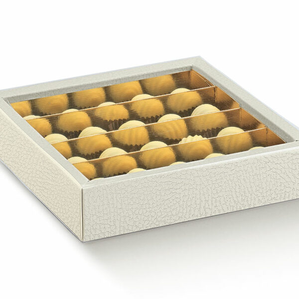 Eleganckie pudełko wykonane z wysokiej jakości tektury z oryginalnym tłoczeniem (imitacja skóry) w kolorze białym ze złotą wkładką i okienkiem doskonale eksponującym wyroby cukiernicze. Posiada również przezroczystą opaskę wykonaną z tworzywa sztucznego, która chroni zapakowane produkty przed zniszczeniem. Idealnie nadaje się do pakowania pralin, trufli i czekoladek.