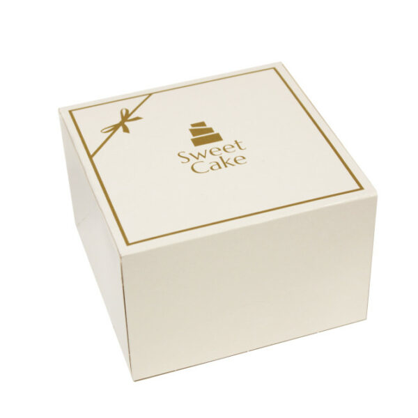 Białe opakowanie na ciasto, ze złotym nadrukiem i stylową obramówką. Świetnie sprawdzi się do pakowania ciast i deserów.Opakowanie wykonane jest z wysokiej jakości tektury, chroniącej przed zniszczeniem. Zobacz również opakowania z serii Sweet Cake w innych rozmiarach.Rozmiar: 13x13x7 cm